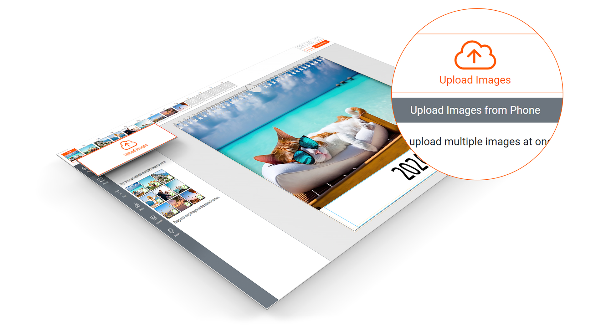 Anche il caricamento delle foto è rapido con il nostro nuovo designer: ti basterà selezionare le immagini desiderate sul computer o utilizzare la nuova funzione di caricamento tramite cellulare e codice QR.